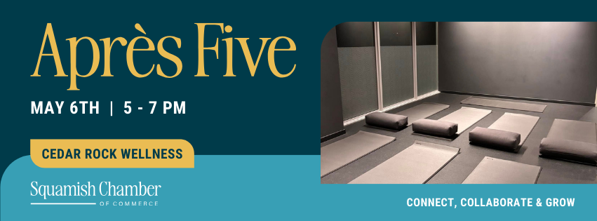 Cedar Rock Wellness About Cedar Rock Wellness :The Squamish Chamber of Commerce is pleased to welcome Cedar Rock Wellness as our host for the May Après 5 networking event. Known for their holistic approach to health and wellbeing, Cedar Rock Wellness is a space where relaxation, self-care, and community come together. From mindful therapies to wellness guidance, they create an environment that encourages connection, balance, and positive energy. Join us as we gather to unwind, share conversations, and celebrate our transition into summer in this welcoming and rejuvenating setting. About Après 5's at the Squamish Chamber: Après 5 networking sessions at the Squamish Chamber of Commerce are monthly events designed to foster connections among local business members. These gatherings provide a relaxed atmosphere for networking, collaboration, and the opportunity to expand professional relationships within the community.Food and beverage are always provided!